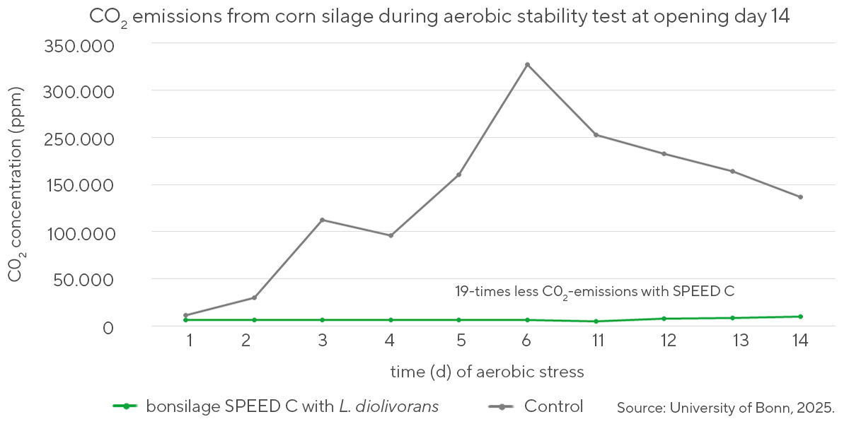 Although carbon dioxide (CO2) plays a crucial role in the initial fermentation, excessive CO2 produced during silage fermentation can indicate poor fermentation and inadequate silage hygiene. Our L. diolivorans strain is known to support efficient fermentation, therefore potentially reducing unwanted CO2 production. This potential was evaluated in an experiment where corn silage was treated with a combination of lactic acid bacteria (LAB), including L. diolivorans, and exposed to 24 hours aerobic challenge after 7 days of storage. Despite the challenge, the inoculated silage had a lower pH, higher lactic and acetic acids, improved aerobic stability and decreased CO2 emissions during the aerobic phase after. By promoting controlled fermentation, the LAB inoculant minimized CO2 emissions while improving aerobic stability.